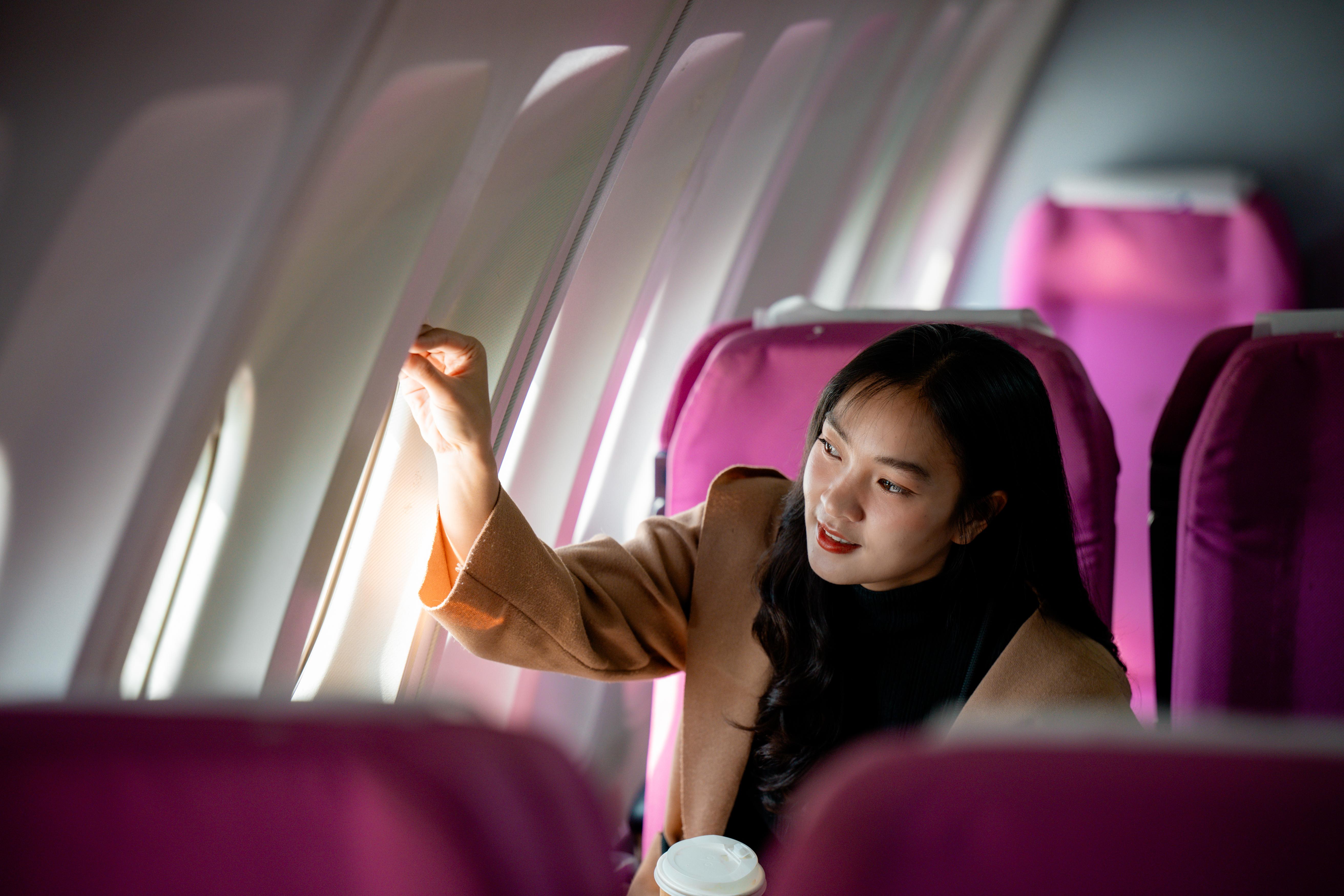 Professional female working, adjusting window shade during flight. Photo Credit: Envato @paegagz