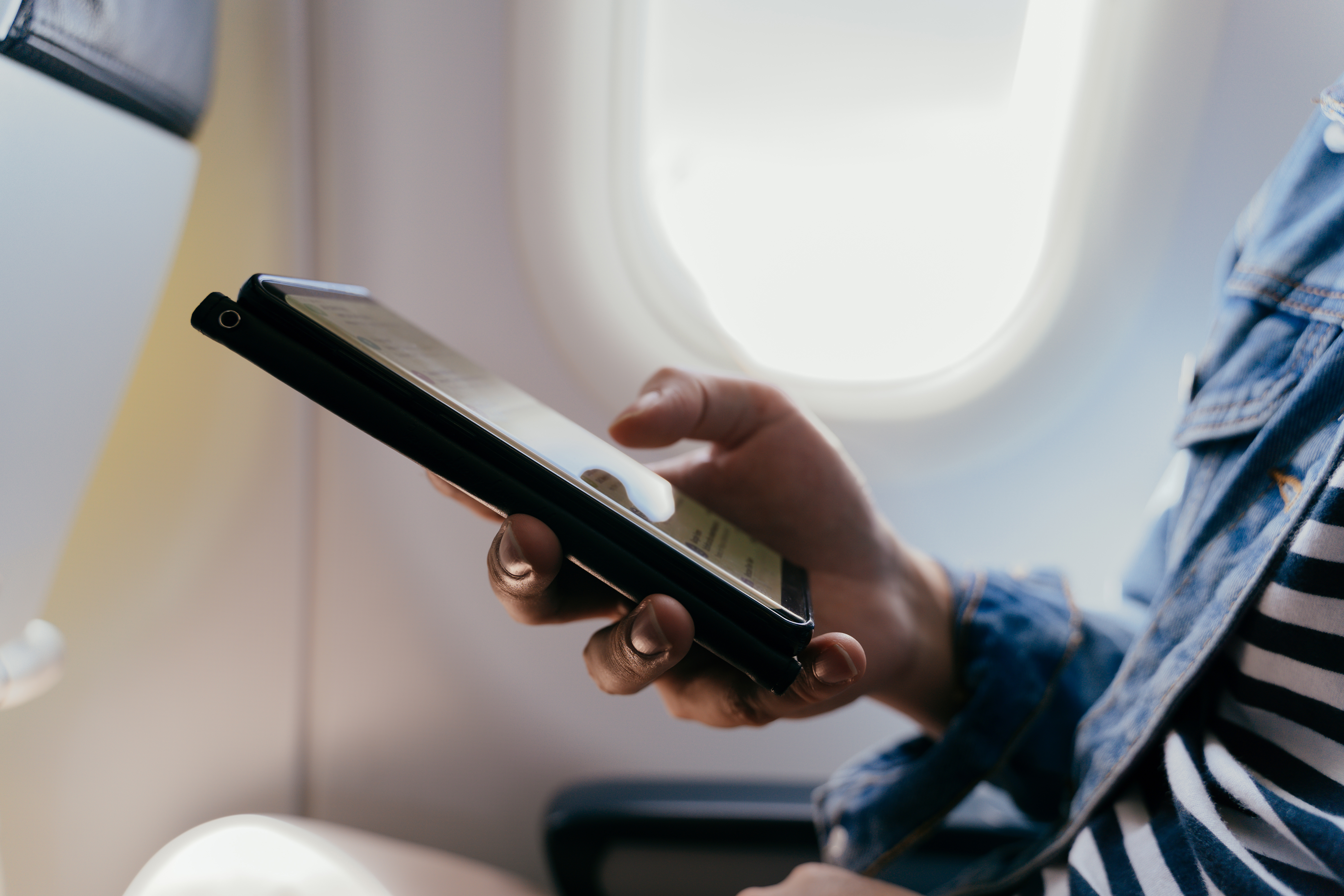 Young woman sitting with phone on the aircraft seat near the window during the flight in the. Photo Credit: Envato @wichayada69