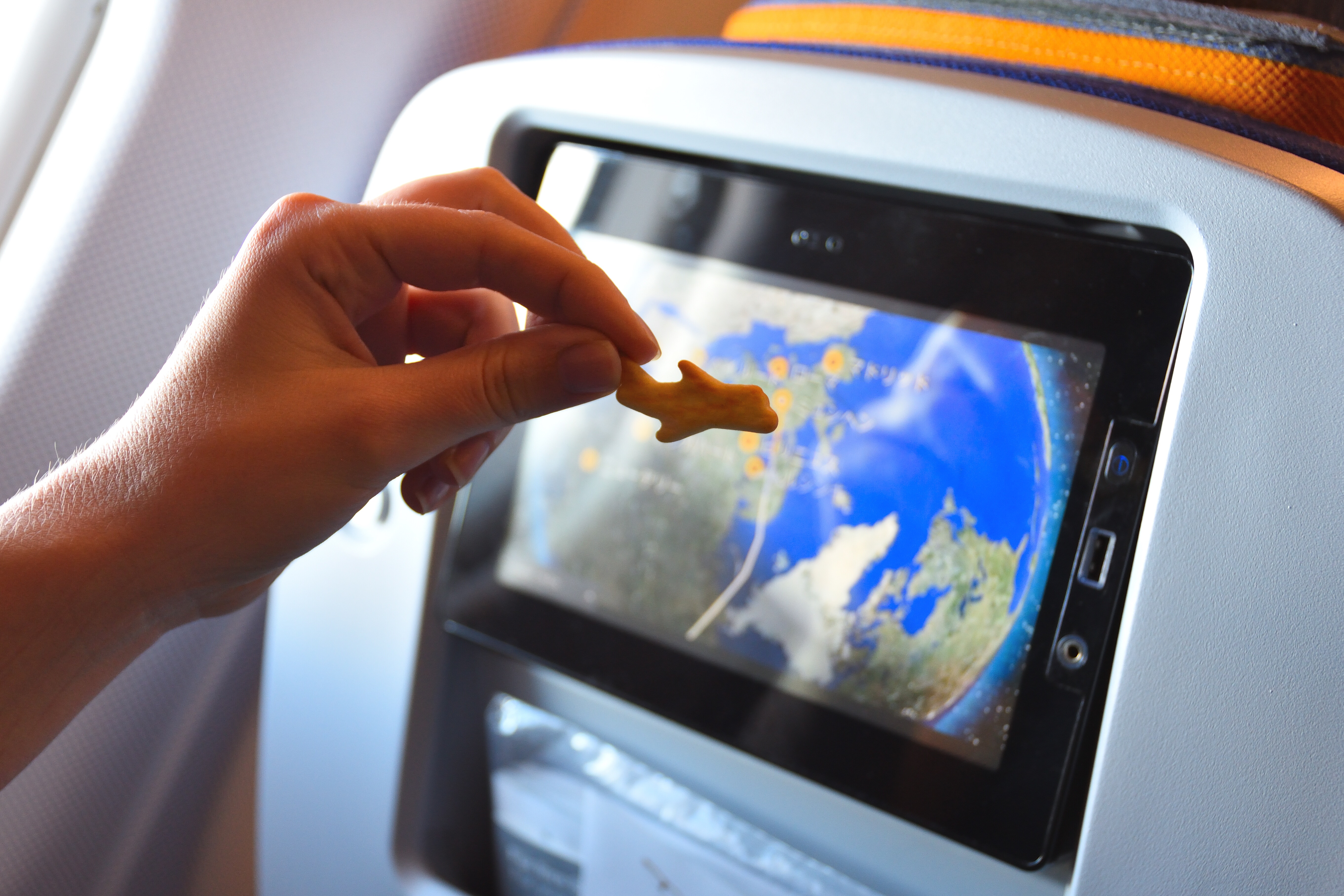 Human hand holding a cookie in the airplane during a flight travel. Photo Credit: Envato @carlo_vstek